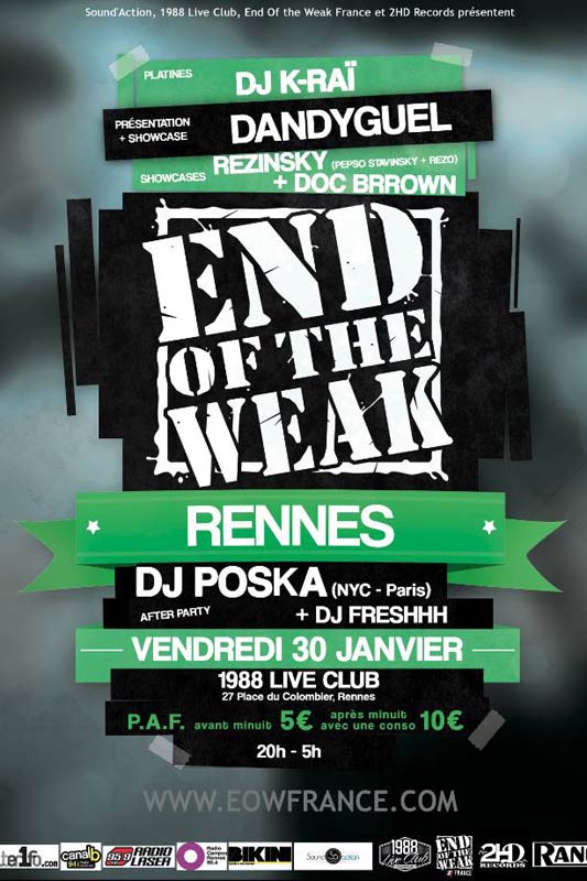 Pour sa 7e saison, la End of the weak (radio crochet pour emcees) fait une nouvelle halte à Rennes; nouveauté qui augmente le challenge : le vainqueur, en plus d’être sélectionné pour la finale régionale, pourra jouer en 1ère partie du concert de la Scred connexion et Micronologie le 28 février à l’Antipode.