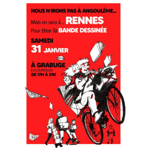 Pour Rennes, c’est chez Grabuge, aux Halles en commun de La Courrouze, à l’initiative des éditions L’Oeuf et Presque Lune, entre autres, que se tiendra un événement pour proposer des rencontres, échanges et animations autour de la bande dessinée, le samedi 31 janvier de 16h à 21h.