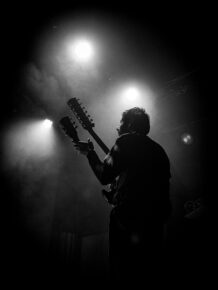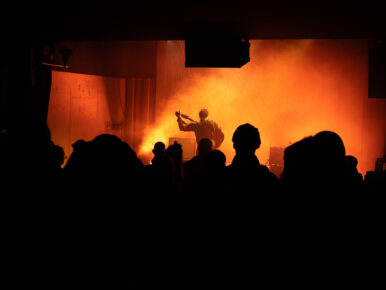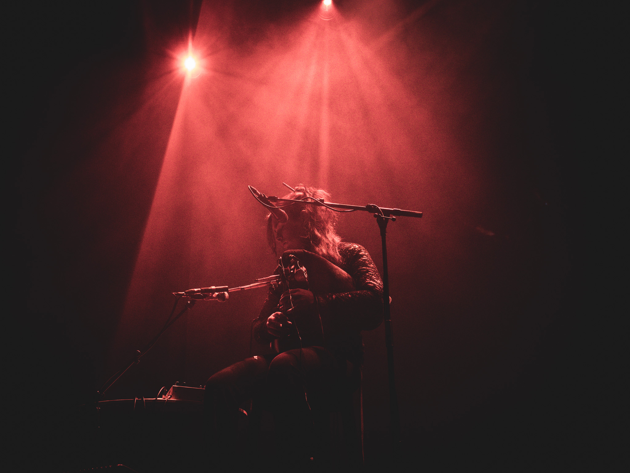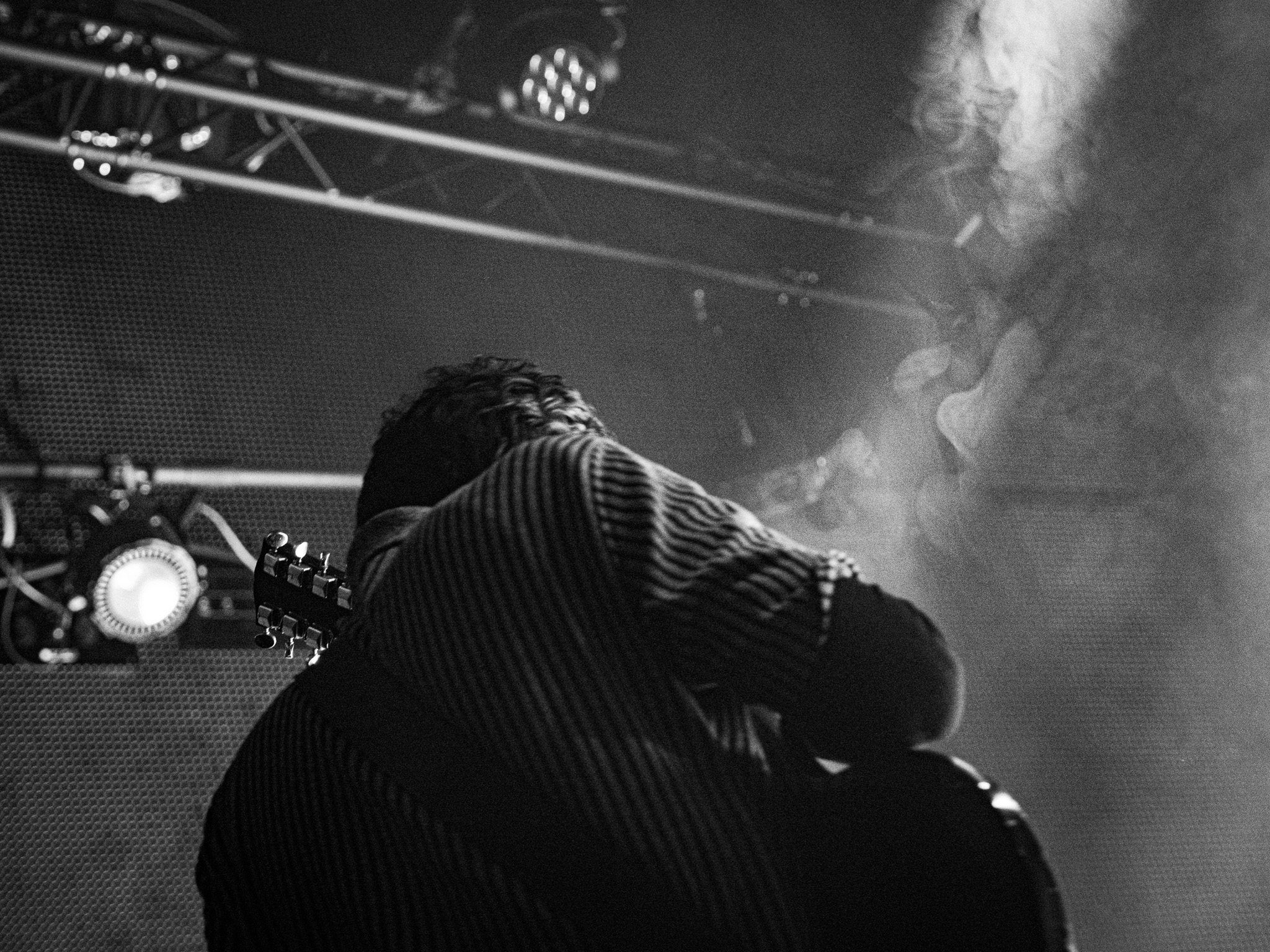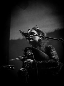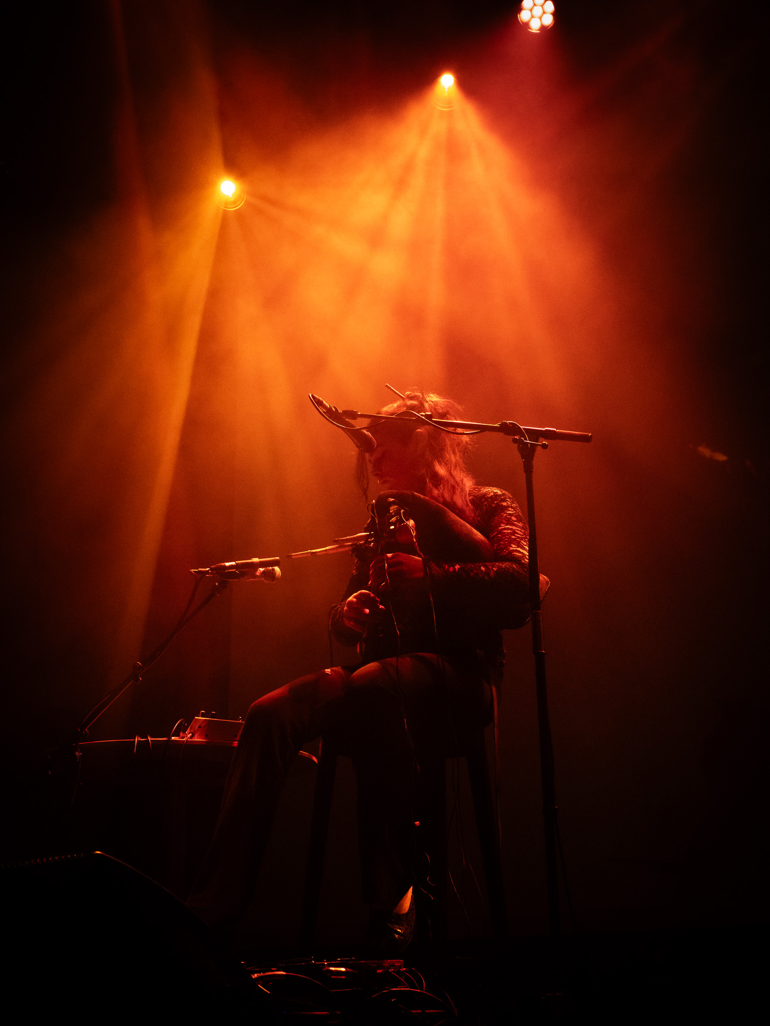 C’est Megabasse, alias de Pierre Bujeau, qui ouvre la soirée, dos au public, comme pour nous dire « voyagez avec moi ». Son projet solo nous fait explorer des paysages sonores avec des motifs répétitifs, contemplatifs, accompagnés d’accords modulaires et de drones profonds, le tout sur une guitare à double manche. Il a su plonger le public dans une atmosphère immersive, presque méditative.