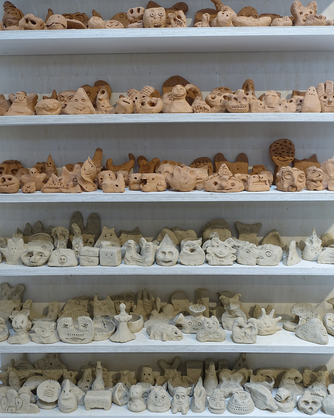 Une carte blanche, des ateliers et un espace où se sont regroupées nombre de petites sculptures en argile : l’artiste Camille Bondon occupait le musée des beaux arts de Maurepas pour plusieurs temps. Dans la galerie du haut, des œuvres d’art sélectionnées et présentés en vitrine, et dans le patio, la dimension collective du projet : un mobilier en bois, et des étagères où s’amoncellent des sculptures. Par leur geste de fabrication où on été conviés les habitant·es du quartier ainsi que les enfants des écoles environnantes, c’est notre lien aux objets qui est ici interrogé : que représentent-ils pour nous ? Peuvent-ils être source de réconfort ? C’est ainsi qu’apparaissent les « bienveilleuses », figurines de terre, souvent souriantes et inventives, qu’il est réconfortant d’aller découvrir.