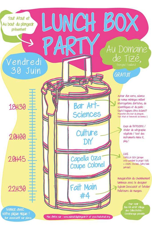 L’association rennaise Tout Atout vous invite le 30 juin à découvrir ses activités au Domaine de Tizé. Lunch Box Party, ou comment mettre en boite ateliers Do It Yourself, rencontres et concert....