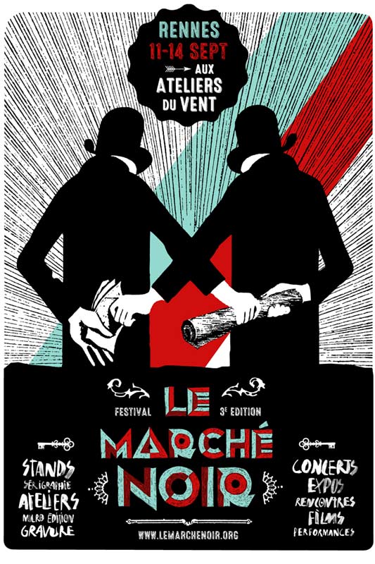Pour ceux qui auraient raté les deux premières éditions du Marché Noir à Rennes (mais où étiez-vous donc ?), sachez que l’évènement se développe autour de la micro-édition. De mikros en grec, petit, et editio au XIIIe siècle (nous vous passons les racines latine et les déclinaisons du verbe donner), entendez là qu’il s’agit d’un travail de fourmi; des travaux préparatoires aux techniques d’impression, le tout en totale indépendance, ce sont plus de 42 ateliers ou artistes qui seront présents pour ce salon du 11 au 14 septembre aux Ateliers du Vent.